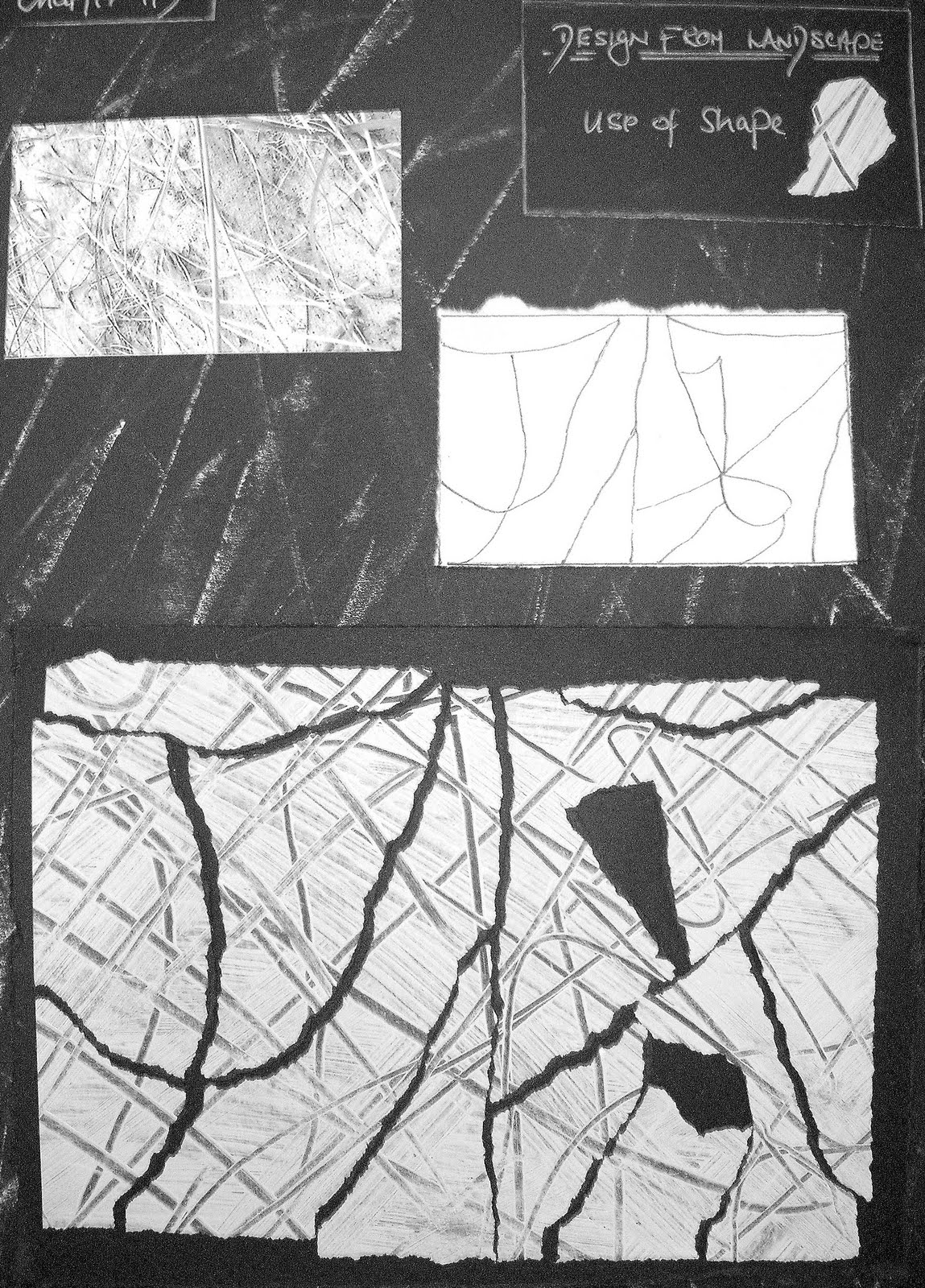 DETAIL of design from landscape; original source dried grasses; using paper washed with acrylic and sgraffitto lines made with a twig.